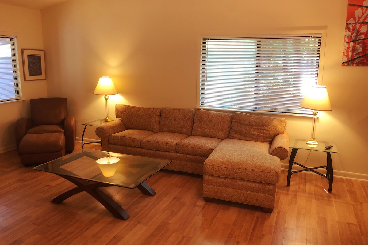 Secluded and peaceful, the name of the street says it all: Sunset. This gated residence offers breathtaking sunset views across a sprawling 50 acre farm. Take in the landscape, complete with horses & cows, or retire to your exclusive guest house, complete with full kitchen, refrigerator, and washer & dryer. This one big room guest house has a king bed & queen sofa bed, and comes with your own door code, parking space, and private, fenced-in back yard for your pets. (pet fee applies).
