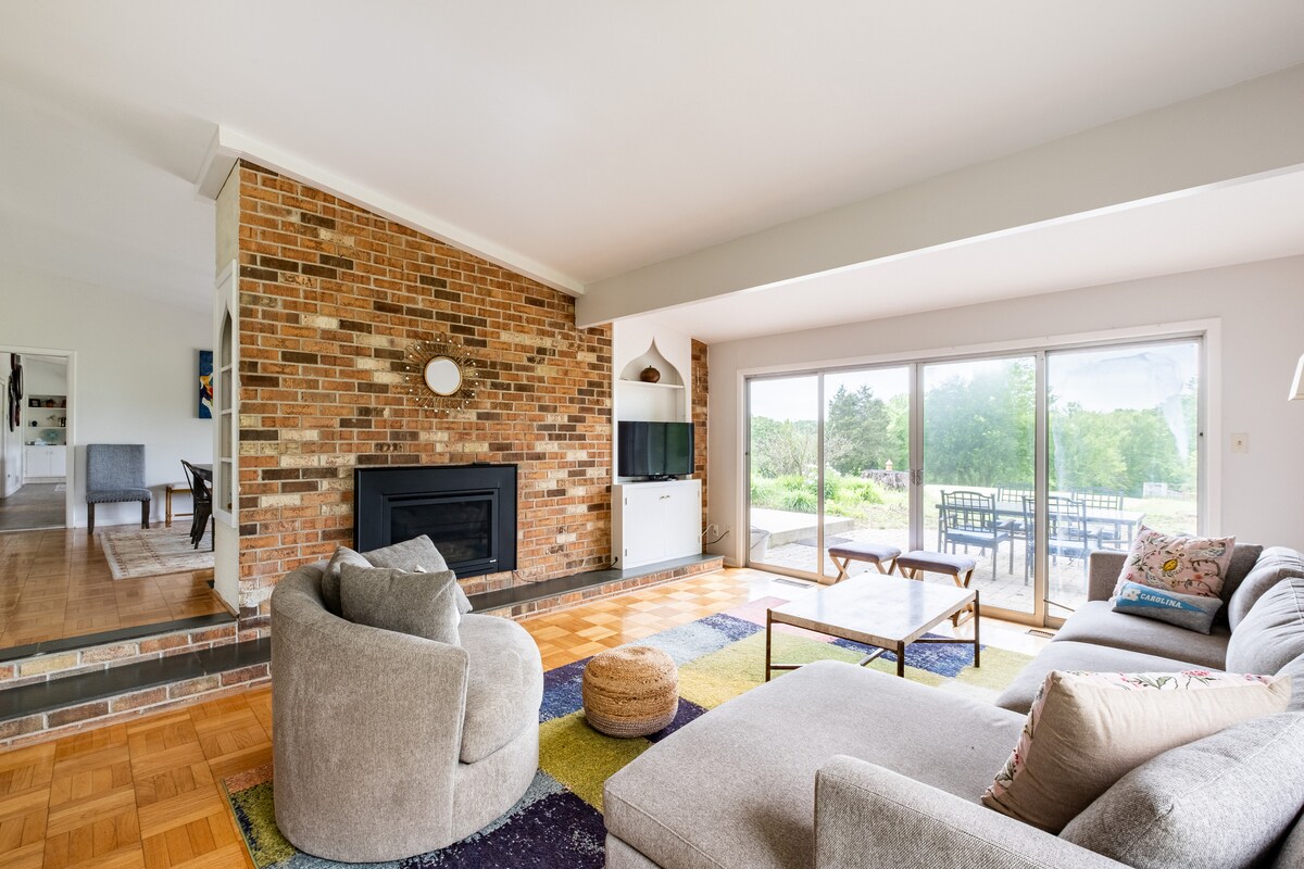 18 minutes to down town Chapel Hill/Franklin Street or historic & quaint downtown Pittsboro. Relax in a beautiful farm house on 10 acres near the Haw River with rolling pastures, woods, chickens, ducks, cows and and pond views. GREAT couple weekend getaway, those traveling to UNC/Duke sporting events, families with kids. Can interact with animals and relax in serene setting