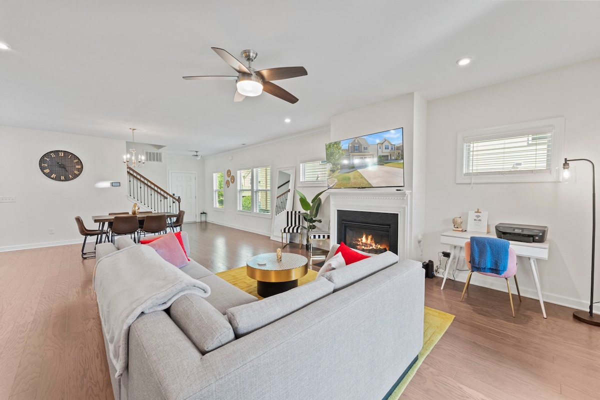 Step into our modern 3-story retreat with 5 bedrooms, 8 beds & 5.5 baths — ideal for large groups & families. Enjoy a game room with Meta Quest 2 & air hockey, elegant black-white-gold décor, and spacious, comfy bedrooms. Unwind in style, recharge, and create unforgettable memories in this chic Cary haven. Book your stay today!Close to Raleigh, RTP & RDU Airport. Free parking, self check-in, and a private backyard with fire pit & swings — ideal for relaxing evenings with your group.”