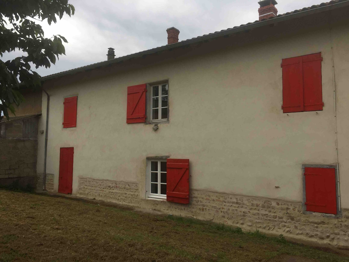 Situé entre la Dombe et le Beaujolais, à 4mn de l'autoroute A6 (Sortie Belleville en Beaujolais), 8 mn gare SNCF, 35 mn de Lyon, 500 m de la voie bleue à vélo) au calme. Grand studio tout équipé, cuisine, lit 160 cm, lave-linge, salle d'eau et wc indépendants, climatisé, wifi, terrasse ext privée, barbecue, parking gratuit et sécurisé VL, abrité pour vélo..., draps et linge de toilette, café, thé, chocolat et boissons fraiches fournies . Animaux OK. Arrivée dès 15h00, départ avant 11h00