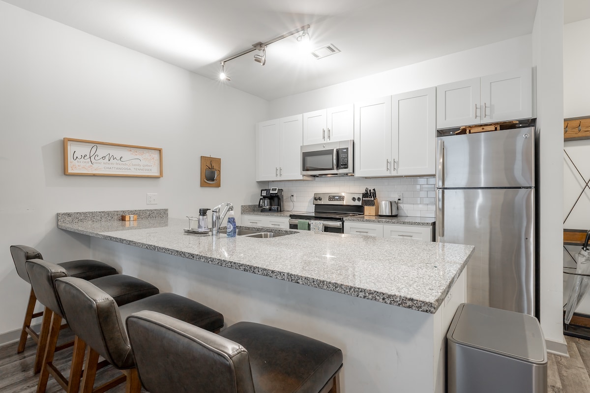 Welcome to downtown Chattanooga! This stylish one bedroom condo offers all the comforts of home and the feeling of a five star hotel! ⭐️You will find a king size bed to get that well deserved rest, high speed internet, a dedicated work space and full kitchen with unlimited coffee and snack bar to prepare for the day ahead. Did we mention you are in walking distance to all the local hotspots our charming city has to offer! Book now - we'd love to have you stay!!!