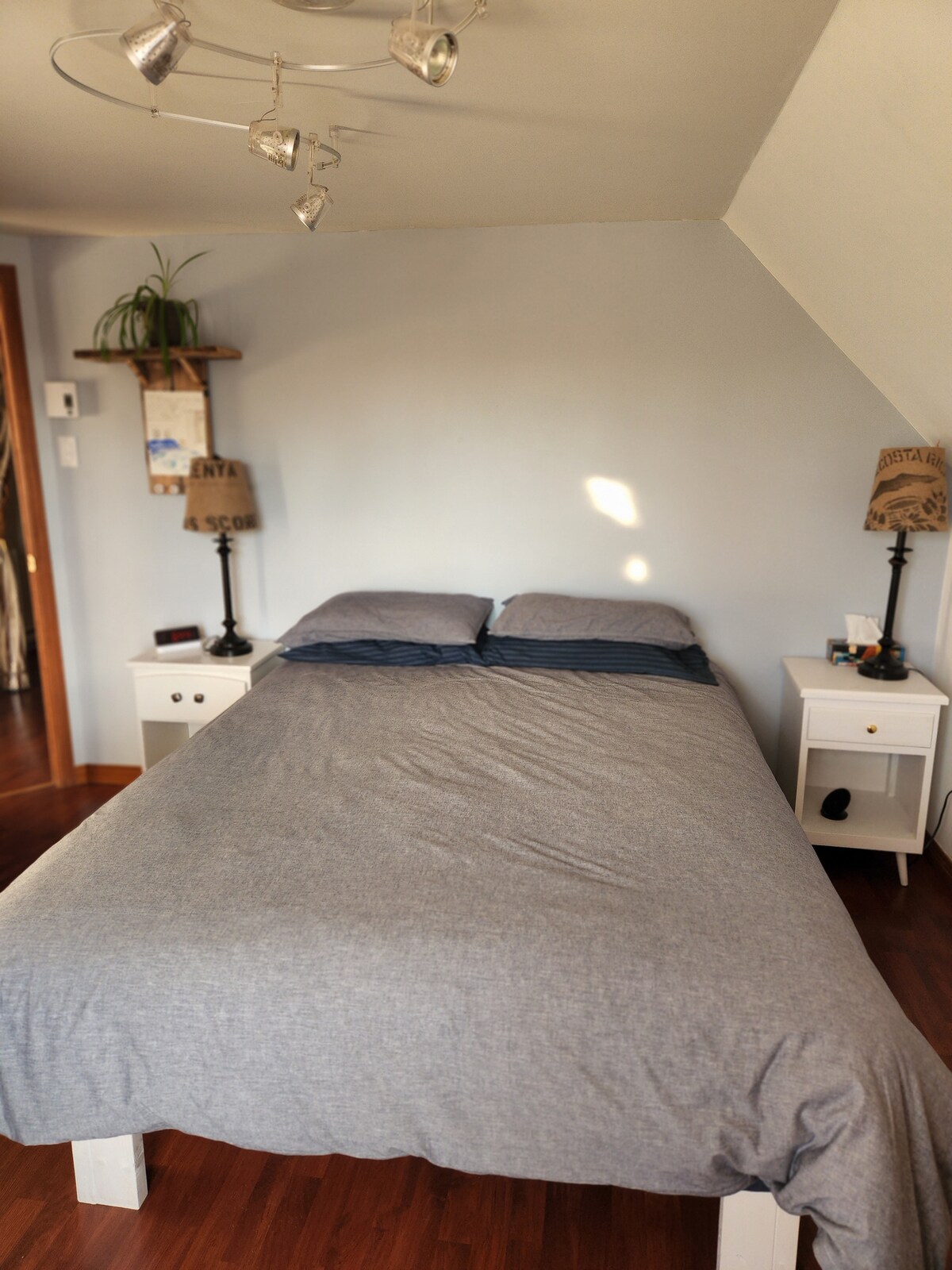 Comme une suite a l'hôtel, grande chambre privée avec petit salon et salle de bain complète. Insonorisée et climatisée, vous dormirez comme des bébés. Le cable et les canaux spéciaux, ainsi que le Wifi haute vitesse vous sont offerts. Également offert, un petit déjeuner pour commencer la journée. Maison ou il fait bon vivre, entourée de la nature boréale. Nous sommes a quelques minutes des grands artères. Grand terrain aménager en permaculture.