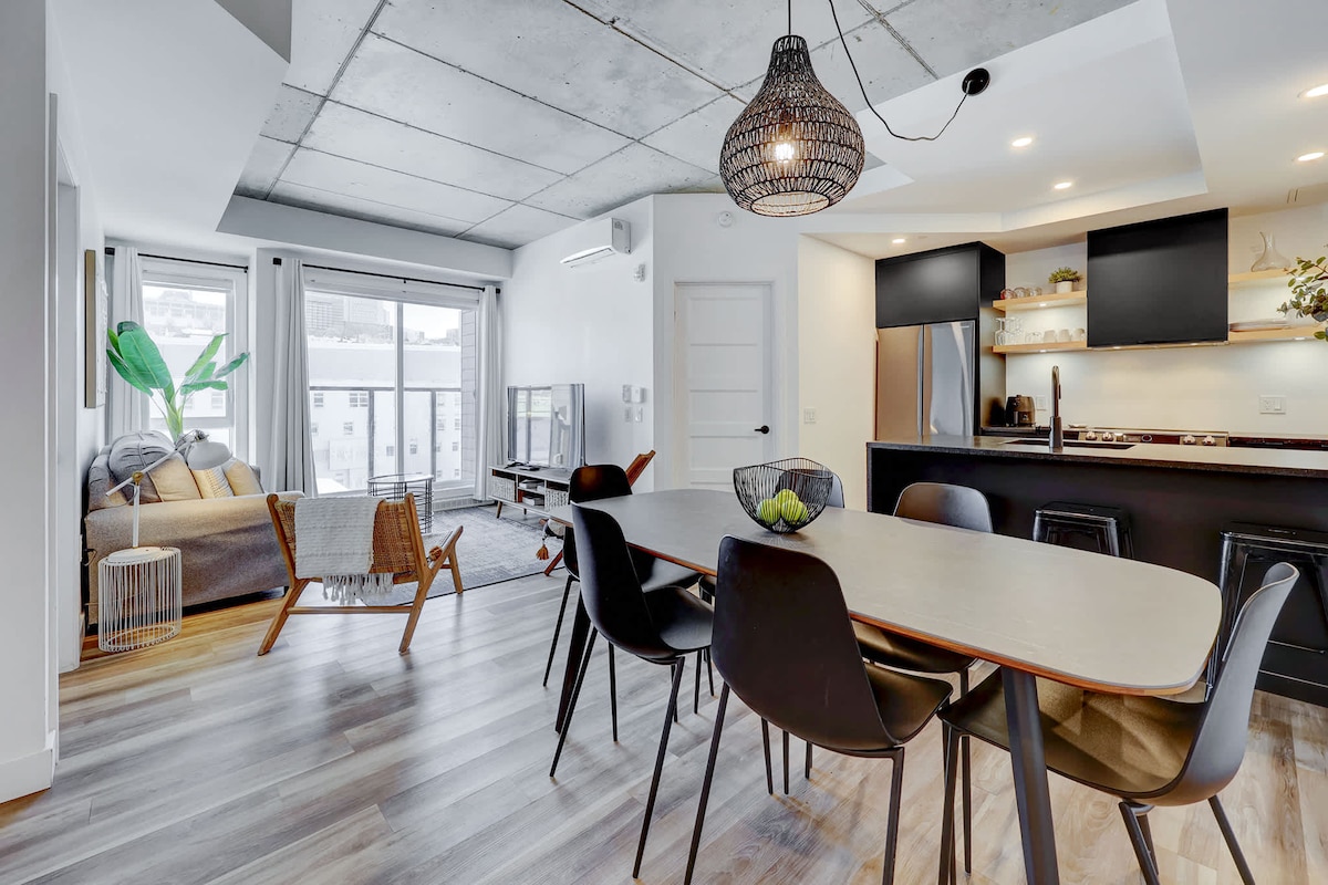Come and enjoy an unforgettable stay in the heart of the Saint-Roch district in Quebec City. This modern and luxurious condo will charm you as much by its common spaces as by its interior design. ✧️ Indoor Parking included ✧️ Roof terrace with pool, dining area & outdoor fireplace ✧️ BBQ available year-round on the rooftop. ✧️ Fitness room available ✧️ Functional and pleasant apartment ✧️ Fast wifi and work space ✧️ Just a 15 minute walk to Old Quebec