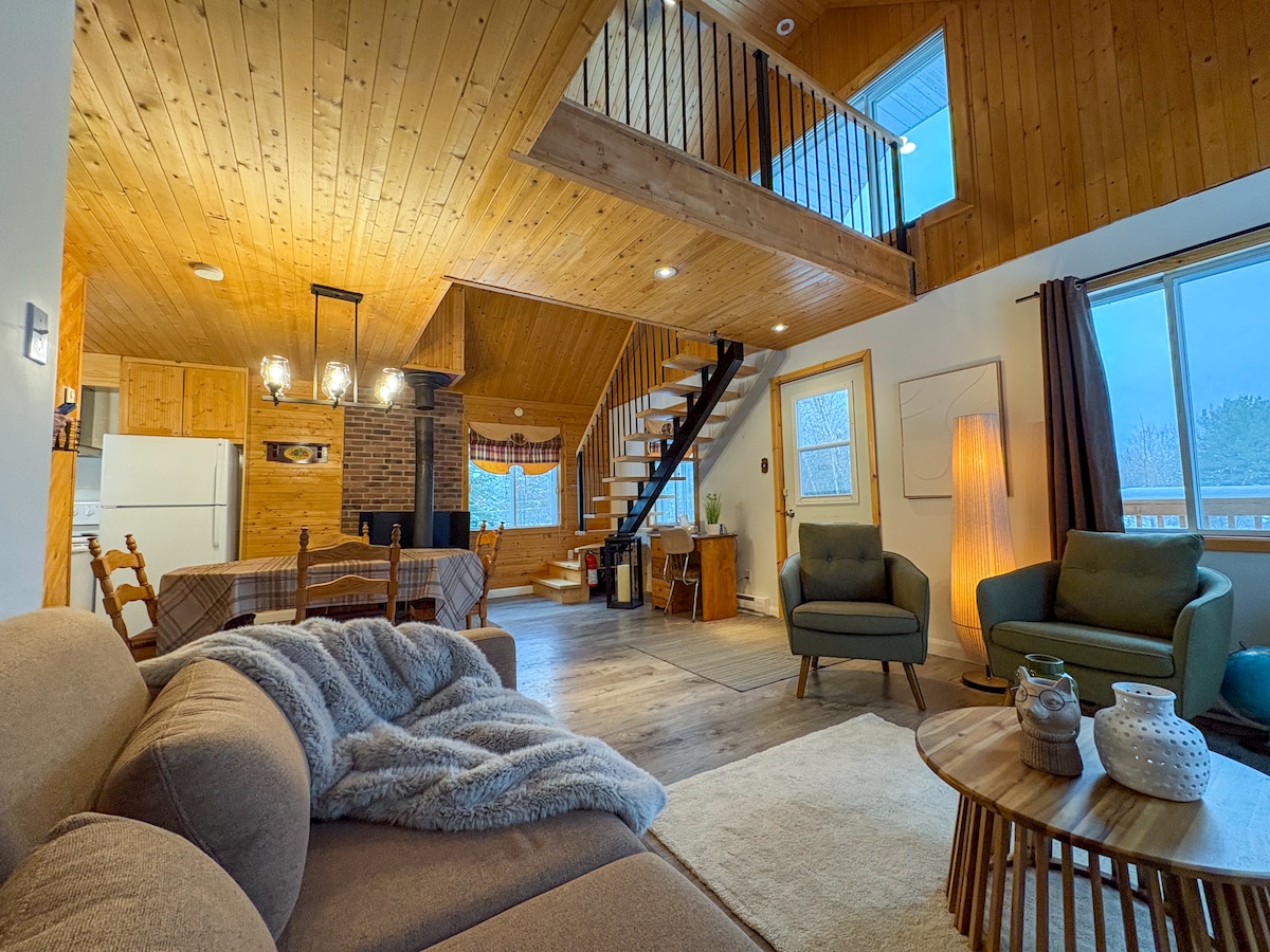 Envie d’une escapade en pleine nature? Ce nouveau chalet à flanc de montagne et de style scandinave saura vous charmer. Avec son terrain de plus de 1 million pieds carrés, vous pourrez profiter sur place d’un lac, d’une rivière, de sentiers pédestres et bien plus! Vous séjournerez dans un endroit où la détente et la nature sont au rendez-vous. Bien équipé, le chalet n’attend que vous! Conçu pour 2 personnes mais pouvant accueillir jusqu’à 3 personnes avec le canapé-lit (simple).