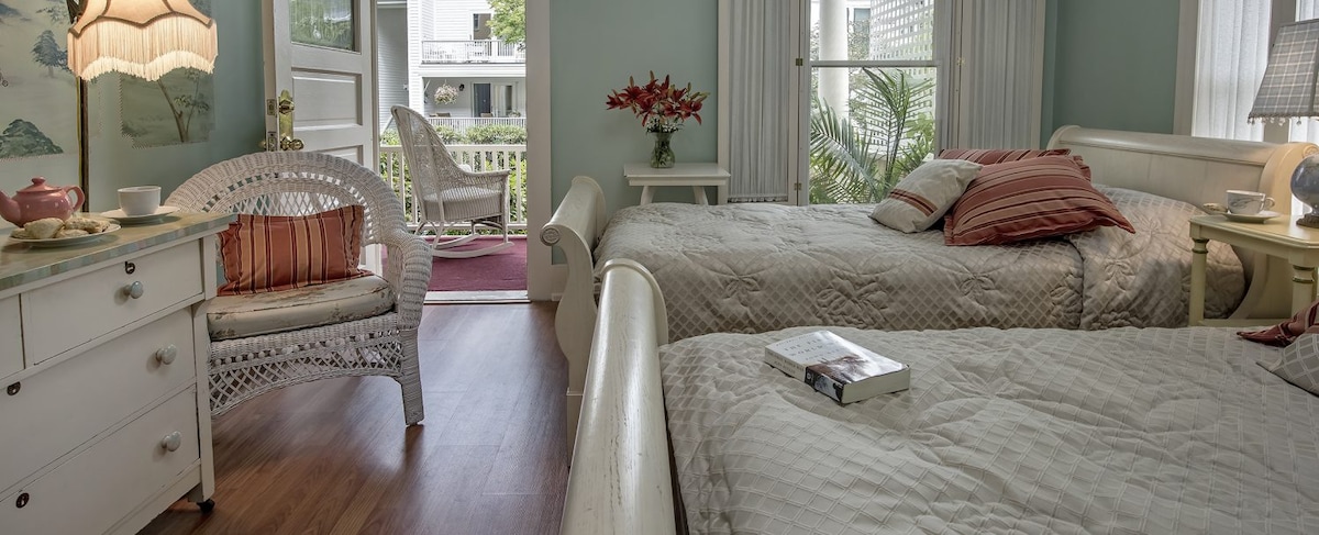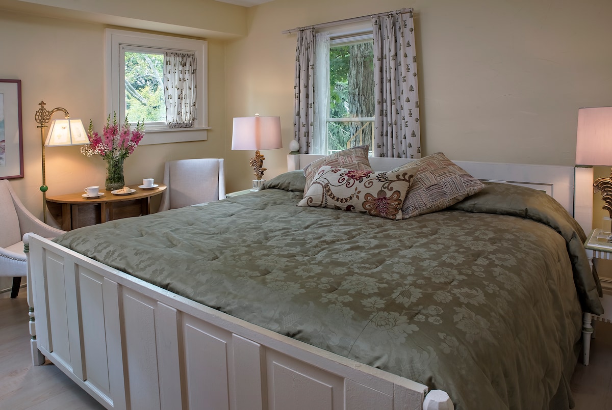 Experience the elegance that Clare can offer; complete with an indoor cafe table overlooking the park. Talented, wealthy, beautiful, and controversial, Clare Boothe Luce (1903-1987) is best remembered as a congresswoman, ambassador, playwright, socialite, and spouse of magazine magnate Henry R. Luce of Time-Life-Fortune. Well known in her career as managing editor of Vanity Fair magazine. ROOM FEATURES: King bed, Kitchenette Neo angle shower