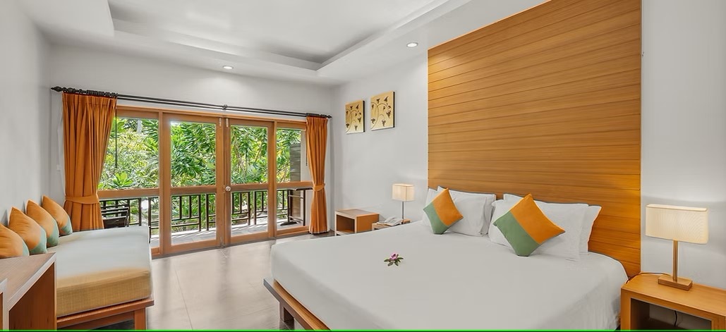 ห้องพักสไตล์บาหลีโคซี่ โดดเด่นด้วยประตูและหน้าต่างทรงโค้งไม้ ให้ความรู้สึกอบอุ่น เป็นส่วนตัว และผ่อนคลาย ตกแต่งด้วยวัสดุไม้แท้ โทนสีธรรมชาติ และแสงไฟวอร์มไลต์ สร้างบรรยากาศเหมาะสำหรับการพักผ่อนอย่างแท้จริง ภายในห้องมีเตียงนอนขนาดใหญ่ ผ้าม่านสีเขียวเข้มสไตล์รีสอร์ต โต๊ะทำงาน/โต๊ะเครื่องแป้ง ทีวี และห้องน้ำในตัว เหมาะสำหรับคู่รัก นักเดินทาง หรือผู้ที่ต้องการพักผ่อนแบบสงบ ๆ ใกล้ Fisherman’s Village เกาะสมุย