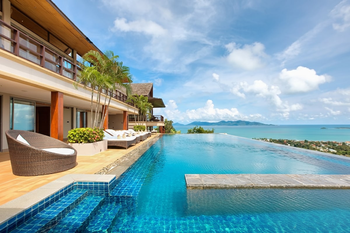 Baan Jakawan has the biggest and nicer pool at Koh Samui . The charm with modern luxury, ideal for large families or groups. This spacious 8-bedroom villa sleeps up to 14 adults and 6 kids, each room with its own en-suite and dressing area. Enjoy breathtaking bay views from the open-plan living room, relax by the Biggest Infinity Pool at Koh Samui !