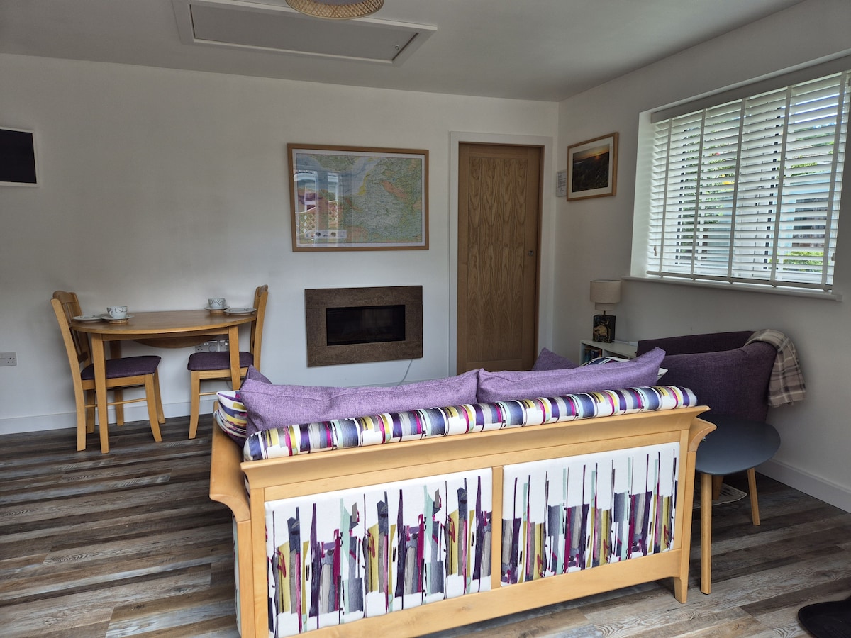 Our cottage is a quirky wooden framed, tin clad cottage, sitting on the banks of a stream, next to our house. Although small it feels much bigger with a fully equipped kitchen, bedroom and bathroom. It can sleep 4 people with the use of the sofa bed. It features a wood burning stove, (it also has central heating ;-)), a gorgeous mural across one wall, a veranda for sitting and watching the world go by, oh and it also has full WiFi, smart TV and sound system if this all sounds a little rustic.