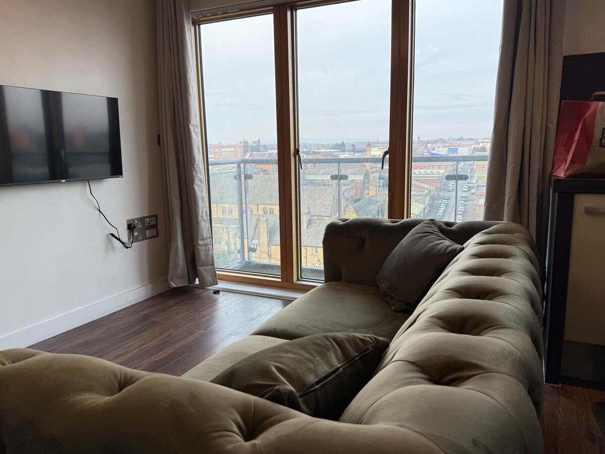 Beautifully designed & modern home away from home located in the city centre, perfect for all stays. • Direct view of AO Arena • 10-minute walk to Victoria Station, Deansgate & Spinningfields • 15-minute walk to Market Street • Spacious open-plan living area with 65” TV, soundbar & Netflix • Juliette balcony • Fully equipped kitchen • Memory foam double bed with 50” smart tv • dressing table • Modern bathroom • 500mb Wi-Fi •long stay parking available at extra cost next to key point