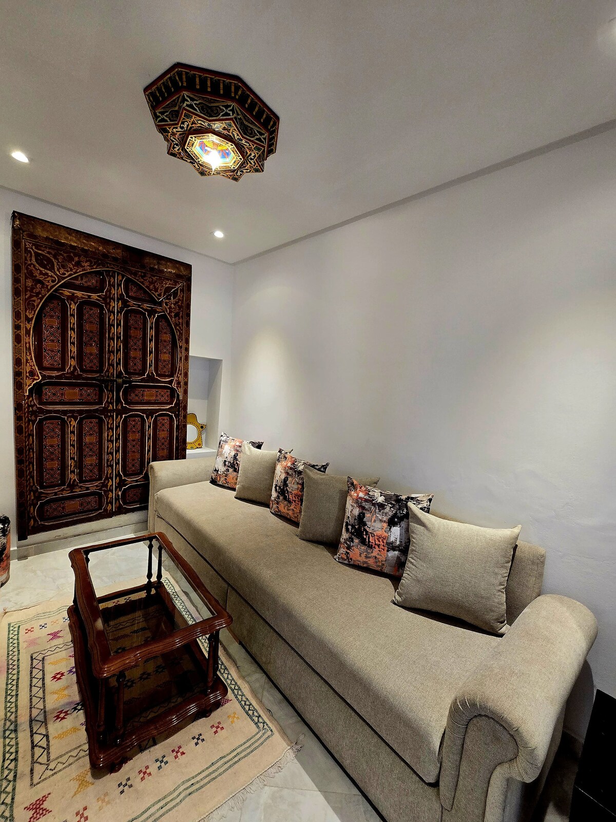 Gemütliche Maisonette Wohnung, direkt am Tor zur Medina „Bab Souk“ und direkt am Zugang zum Nationalpark. Sie liegt in einem ruhigen Hinterhof direkt am Bab Souk, dem Tor in die Medina. Die liebevolle Einrichtung ist praktisch und durchdacht. Vom Stil her ist sie architektonisch modern, kombiniert mit typisch marokkanischen Elementen. Die gut ausgestattete Küche gibt die Möglichkeit selbst zu kochen. Es gibt eine gemeinsam nutzbare, lauschige Dachterrasse mit schönem Blick auf Stadt und Berge.
