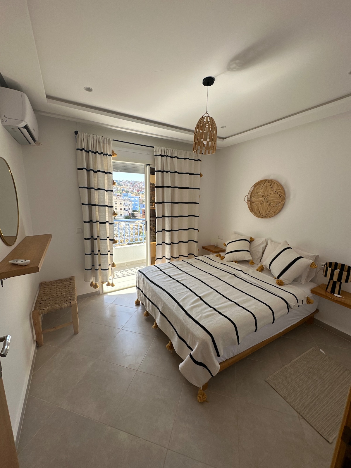 This spacious apartment located 1km away from downtown,offers breathtaking views of the city's iconic blue streets and surrounding mountains. Equipped with modern amenities, including , a fully stocked kitchen, high-speed Wi-Fi, and a comfortable living area, our apartment ensures a comfortable and convenient stay. The stylish decor blends traditional Moroccan elements with contemporary touches, creating a unique and inviting atmosphere