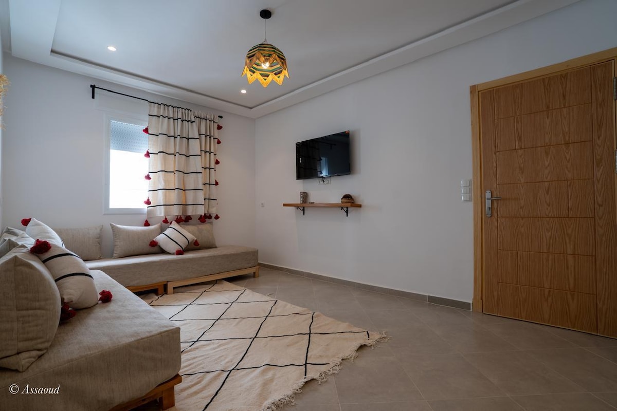 Situé au cœur de la Médina,vous serez à quelques pas des sites historiques et des restaurants locaux. L'appartement dispose deux lits 140 et deux lits 90, il est possible de rajouter un lit 140 dans un des salon et permet d augmenter la capacité à 6 voyageurs. Equipé de toutes les commodités modernes, il combine authenticité et design contemporain pour un séjour agreable. Depuis votre terrasse privée vous plongerez au coeur de la Médina et pourrez admirer le coucher de soleil.