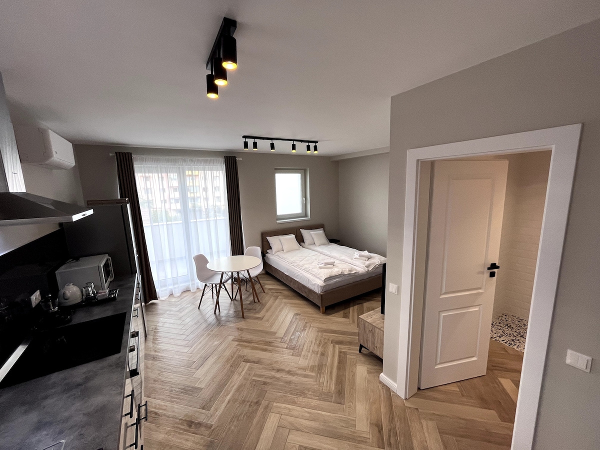 Find yourself relaxing in a modern and cozy apartement with the garden view, away from the crowded trafic. Extended storage space, a fully equipped kitchen, a modern office desk are just a few of the items that will make your stay relaxing and enjoyable at the same time. Just around the corner you can find a 24/7 Profi supermarket, 18 Gym, pharmacy and a local grocery market. A 10 minutes walk will get you to Iulius Mall or a 13 minutes by bus up to the center area of Cluj.