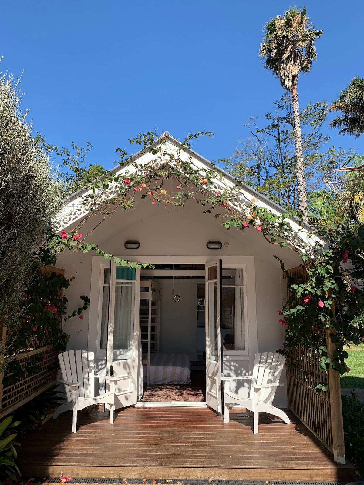 Enjoy a private outdoor space, the accommodation in the style of mid century, a living space with a queen bed and a bedroom with two king single beds, a private bathroom. The kitchenette has a microwave, electric jug, electric frypan, toaster and coffee plunger. There are plates/ utensils etc. Barbeque, hot plates and saucepans on request. Also the apartment is not suitable for mobile babies nor children under the age of seven. A vehicle to get around is recommended.