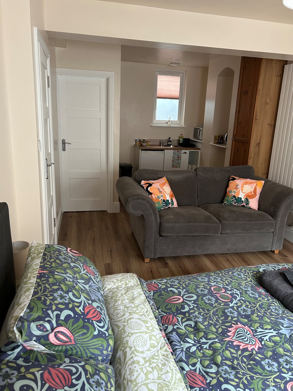 Beautiful self contained basement flat with own entrance. Open plan living area with pull down ‘Murphy bed’ (please ask when booking if you would like to use this bed as it requires host assembly). Full kitchen-dishwasher,oven,microwave & washing machine. Bedroom with wardrobe, dressing table and king size bed- can be separated into 2 singles on request at time of booking. Wet room with shower. Shampoo,conditioner,shower gel and towels provided. Tea,coffee,milk and breakfast items provided.