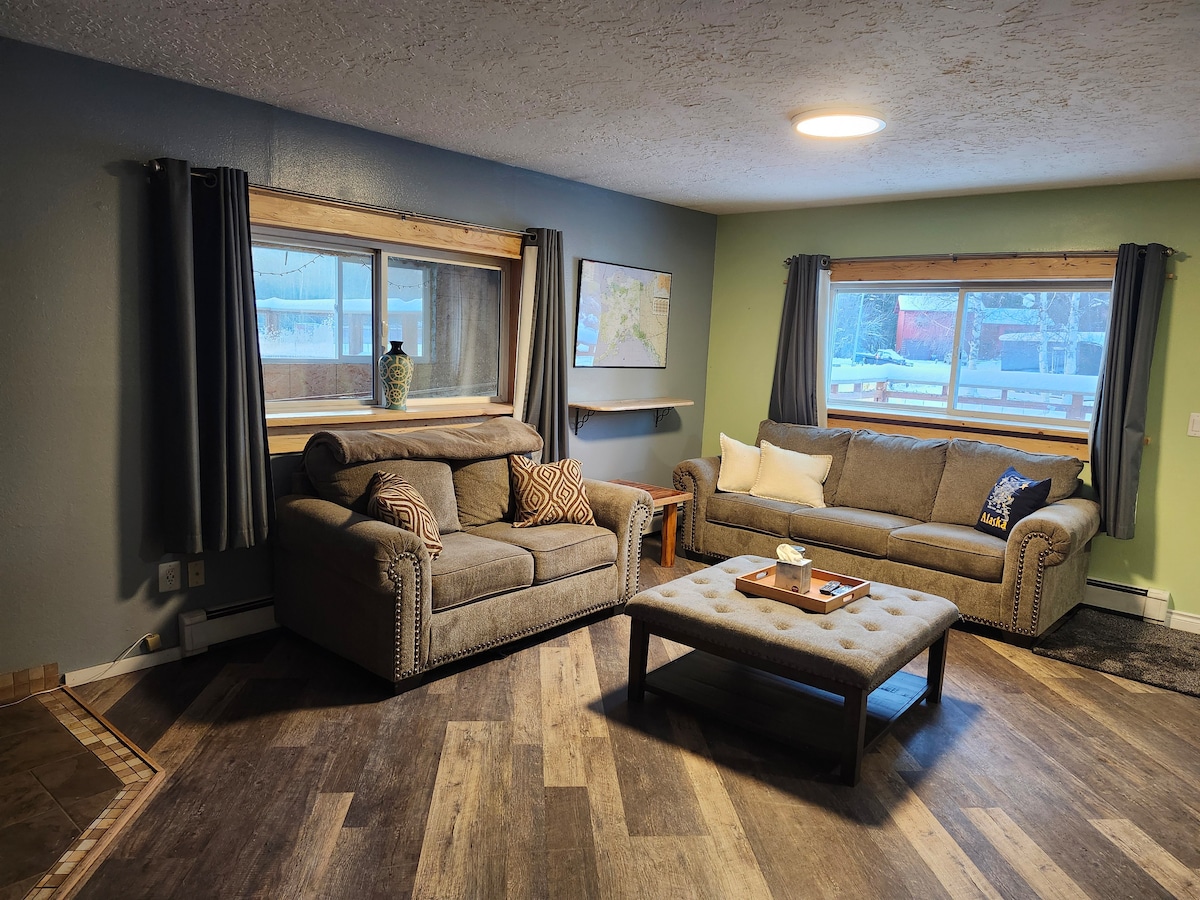 Cozy 1 bedroom 1 bathroom private home, just outside of town only a couple miles from the airport. Close to great trails for hiking and cross country skiing, but outside of town enough to get a great show from the Northern Lights. Newly updated with a quiet environment, perfect get away. Full size washer/dryer, and all kitchen needs. A beautiful Alaskan property which you can watch float planes land and take off from the private pond across the road. Large windows for great views! Pets Allowed!