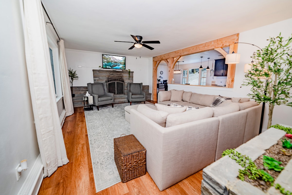 Retreat, isolated get-away but nearby town. This cozy cabin is rustic with some chic flair, decor & recent updates. Privately set on 2 wooded acres & near town. 2 stone fireplaces, indoor Jacuzzi tub, 2 1/2 BA, 3-4 BR & 7 person outdoor hot tub. Excellent WIFI, kitchen & dining. Picnic, grill & fire pit. Great fall foliage, near skiing, near hiking, boat launch. Fully outfitted, just bring yourself!! Willing to accommodate guests—ask!!