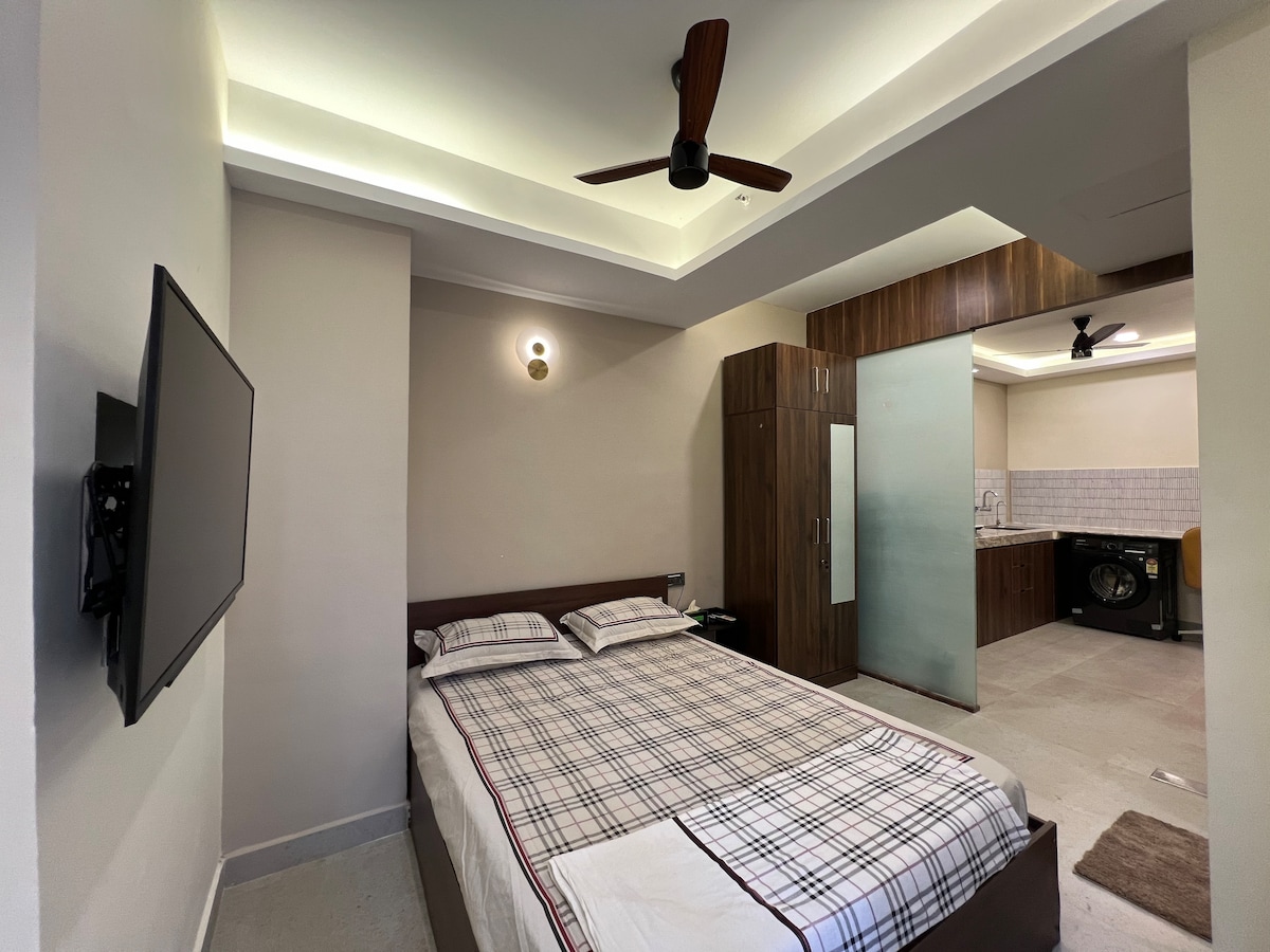 This approx. 210 sq.ft. studio is ideal for a young working couple or a single adult who is not looking to cook lavishly, for e.g. make their daily cuppa, some light breakfast and an even lighter dinner. There's a spacious fridge available inside the room. This home is about 12 m away from the building gate and situated at the NW corner of the parking lot. It's independent with a biometric enabled lock to enable self check-in.