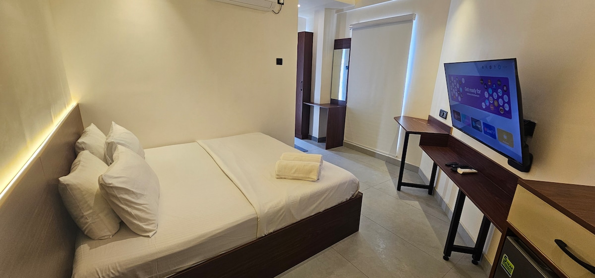 A cozy stay in the heart of Chennai in Nungambakkam. This 200 sq.ft room includes a comfy double bed, private bathroom, work desk, and a compact kitchenette. Located near Apollo Hospital, the American Embassy, Khadar Nawaz Khan Road, and T. Nagar, it's perfect for business travelers, medical visitors, and shoppers alike. Enjoy comfort, convenience, and easy access to Chennai’s key landmarks.