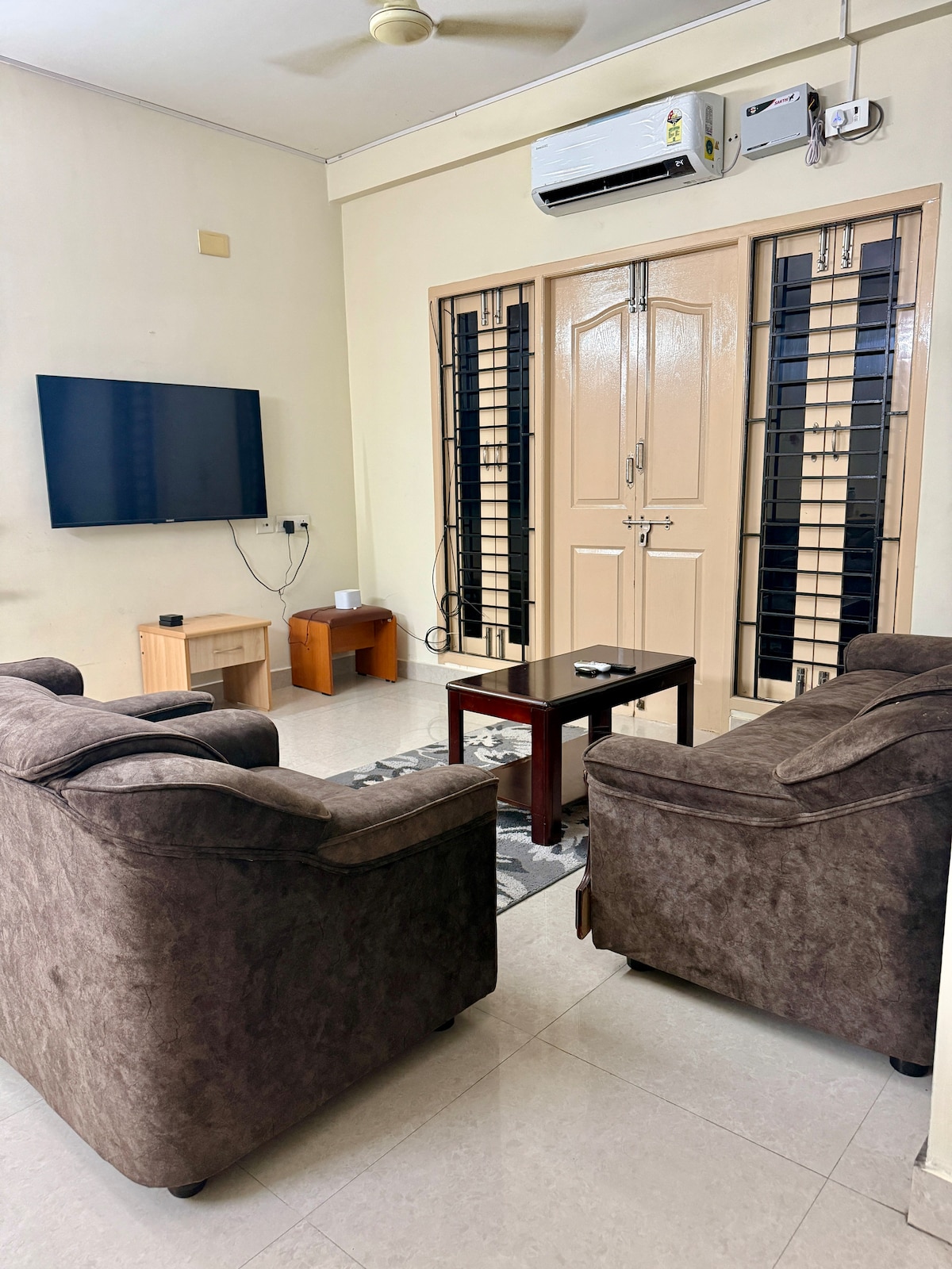 A fully air-conditioned 2bhk with covered car park, located in Sholinganallur, Omr with complete privacy and all the amenities you need within the house. (Apartment name: Casagrand Royale) Living room and one of the bedroom is designed for ultimate relaxation, featuring a 43" screen to enjoy Netflix, Amazon, Disney & Zee. On the other hand, the second room caters to workaholics, offering a dedicated workstation for maximum productivity.