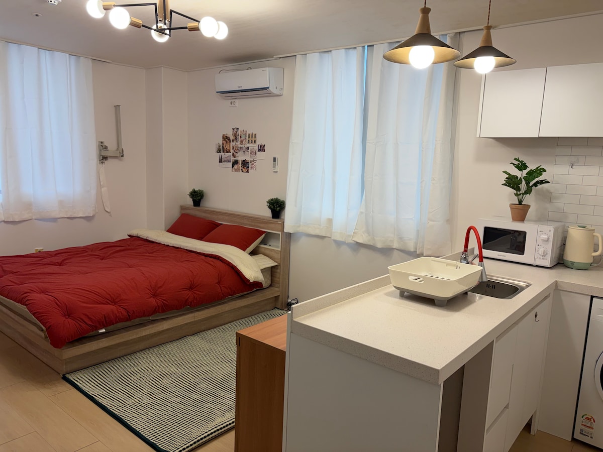 🏡 숙소 소개 📍 위치 천안시내 중심부에 위치 도보4분 거리에 뚜쥬루 베이커리 천안 터미널까지 차량 5분 거리 교통과 생활이 매우 편리한 입지, 출장·가족여행 모두에 적합합니다🤗 🛏 숙소 구성 최대 수용인원:6명 전체 독채단독 사용가능 거실&다이닝 식탁+의자4개 (인원 추가시 의자제공) TV 구비&공기청전기&넥플/유투브 주방 듀얼냉장고 와인잔/소주잔 /맥주잔 식기류, 수저세트, 냄비, 프라이팬 완비 침실 1 퀸사이즈 침대2개 (4인 숙박 가능) 에어컨 구비 5성급호텔 수준의 프리미엄 구스침구 제공 침실 2 슈퍼싱글 침대2개 (2인숙박 가능) 에어컨 완비 욕실 위생적인 환경유지 🐾 반려동물 동반 반려견 동반가능 (추가요금 발생) 🚗 편의시설&서비스 셀프 체크인(비대면) 무료 전용 주차장 엘리베이터 웰컴 드링크(음료수&생수)제공 짐보관 서비스 제공 넷플릭스&유튜브 시청가능 보드게임 ⏰ 체크인/체크아웃 체크인:오후 5시부터 체크아웃:오후 1시까지(조정 가능)