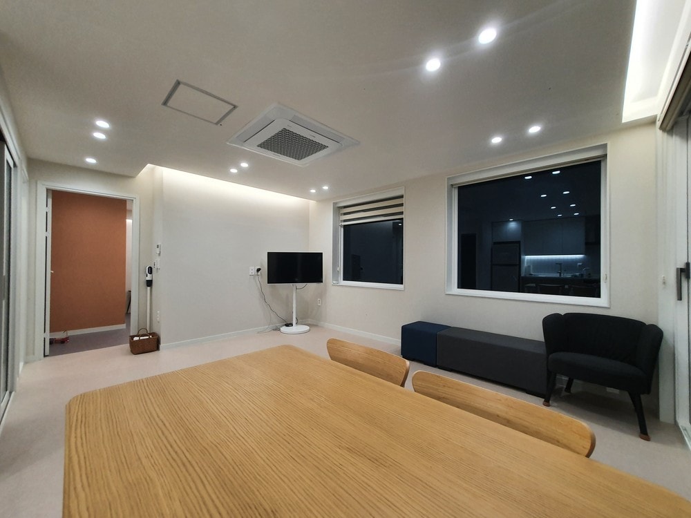 ✔경기도 이천시 장호원읍 중원대로 1317 "다산네트웍스 장호원물류센터" 17평형 복층 / 기준인원 4명 침실 2개 (1층 온돌방-오픈형태, 2층 퀸베드 구비-오픈형태) 욕실 1개 온돌방에는 요와 이불이 제공됩니다. 객실 취사 가능 (객실 내 생선, 청국장 등 냄새가 나는 음식 조리는 불가함) 식기 및 조리도구 구비 (조미료는 구비되어있지 않습니다.) 반려동물 출입금지 (다른 투숙객에게 알러지를 유발 할 우려가 있습니다)