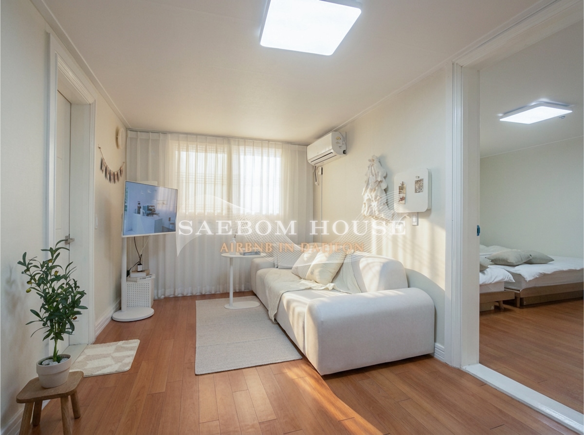 “지금, 여기서 행복하시길 바라는 진심”을 담아 청결하게 운영합니다. 짐보관 무료서비스 제공합니다. [숙소 소개] - 숙소 1층 무료 주차 - 엘리베이터 있음 - 각 방 에어컨 총 3대 - 공원뷰의 도심속 힐링 숙소(+고요함) - 방2[침대4개(3Q+1S)]+넓은 거실+욕실1 - 고급 원목 2층 퀸침대 - “안방” 대형 스크린 빔프로젝터 - “거실” 스마트 TV - 6인용 대형 식탁 - 고급 화장대 + 스튤 2개 - 암막 커튼 - 아기자기한 홈스타일링 이쁜 포토존 - 반려견 동반 가능(추가금 발생) [ 교통편] - 대전역에서 1호선 탑승 1개 정거장 중앙로역 도착 후, 2번 출구 도보 7분 - 대전역 KTX에서 도보 15분 [물품] - 호텔 침구(고온 살균) - 수건(고온 살균) - 드라이기 2대 - 비데 - 샴푸/바디워시/컨디셔너/치약 - 온냉수 정수기, 전자렌지, 그릇, 냄비, 후라이팬 - 세탁기 [8인이상 숙박시] - 8인부터 퀸토퍼 침구 제공