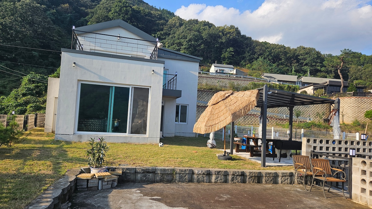 호숫가에 위치한 넓은 마당과 정원이 있는 시골별장감성을 지닌 주택입니다. 오롯이 한팀만을 위한 집입니다.뜰에는 넓은 잔디마당 (200평)과 꽃밭이 있고, 시원하게 탁 트인 하늘과 호수를 전망할 수 있어요. 호수위로 지는 노을을 바라보며 캠핑감성 가득한 불멍의 밤을 보내세요. 마당에서 모닥불과 솥뚜껑구이를 할 수 있고, 데크에서는 화로불멍과 바베큐를 할 수 있어요. 추운 밤에는 거실에서 벽난로를 지피며 밤을 보낼 수 있어요. 마당 한모퉁이에 골프네트가 있고 20m이내 숏게임을 연습할 수 있어요. 밤하늘이 맑은 날에는 마당이나 옥상에서 별헤는 밤을 보실 수 있습니다. *연박 예약시 모닥불 1회 무료로 서비스해드립니다.