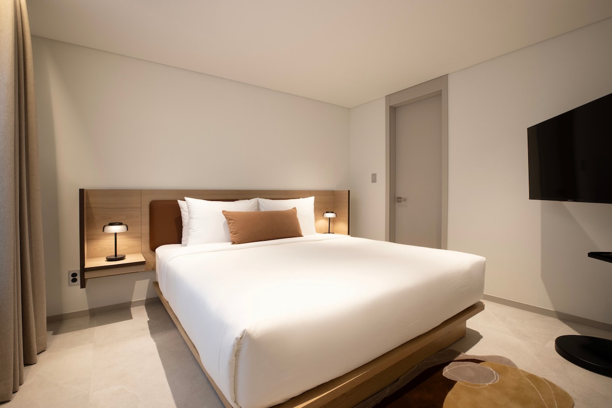초고층뷰에 낭만적인 야경을 더하다 반짝이는 야경에 로맨틱한 시티뷰 시원하게 탁트인 자연 전망의 파노라마 경관 마운틴뷰 편리한 교통과 전통시장을 함께 경험할 수 있는 최적의 위치 효율적이고 여유로운 공간 구성으로 마음편히 누리는 안락한 휴식 눈부신 햇살이 내리쬐는 채광의 침실 포근한 유럽식 호텔 침구, 푹신한 휴식을 즐길 수 있는 침대 밝은 색감의 조명 배치와 모던한 우디 인테리어 마음에 스며드는 편안한 힐링,에너지 충전, 만족스러운 호캉스를 즐겨보세요!