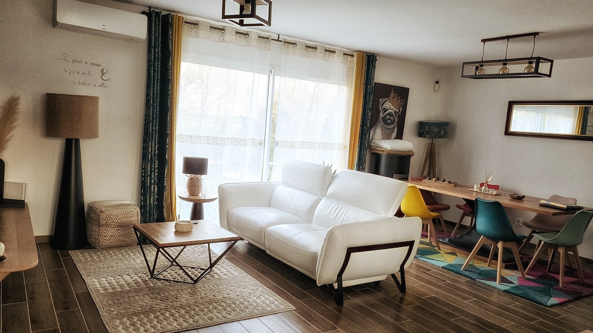 Logement de charme Classé 4 étoiles par l'office de tourisme, adapté pour 6 personnes, famille, amis, collègues de travail .... La maison dispose d'une pièce de vie avec coin salon ( Canapé convertible), coin salle à manger sur cuisine ouverte. Au RDC une chambre avec lit double, une salle d'eau ( Douche et WC ). A l'étage une grande salle de bain (double vasque, douche et WC), une grande chambre lit double avec coin bureau. Un coin détente lecture jeux.