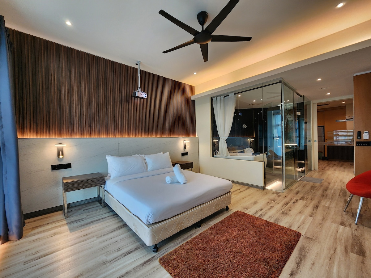 📍Pertama Residency Welcome to Grey City! This studio is newly set up with lots of love, combines contemporary decor with modern amenities and an experience all can enjoy especially Jacuzzi moment with your love & 100” projector screen w/Netflix. This unique place has a style all its own, it offers a cozy, clean, quiet & refreshing stay environment for couples. Come and experience in the Grey City! See you.