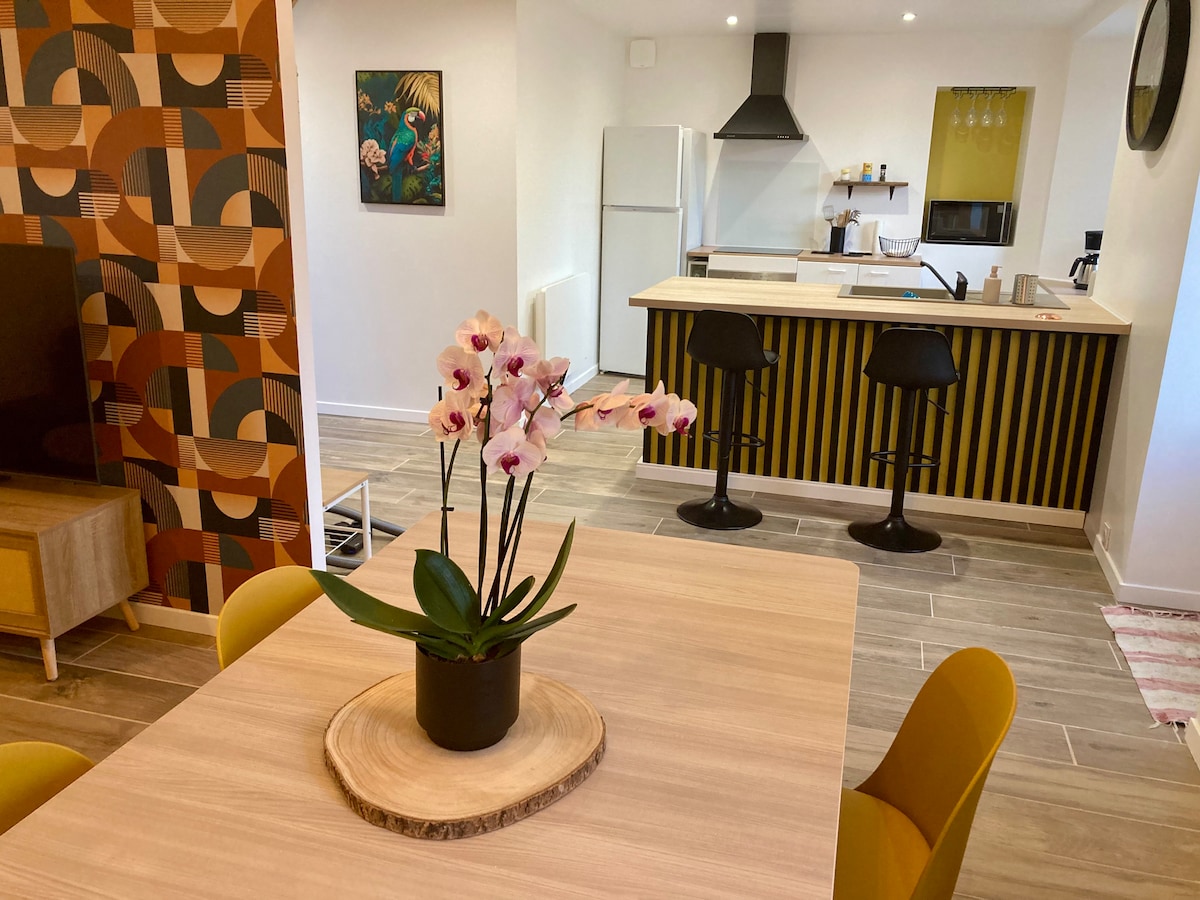 Ancienne maison rénovée, paisible, chaleureuse, et cosy qui offre un séjour détente pour toute la famille à 2mn à pied de la mer Cuisine équipée, avec four, micro onde, lave vaisselle, cafetière, nespresso, bouilloire, grille pain, appareil à raclette... Cheminée décorative (non fonctionnelle) Salle de bain avec douche et wc Escalier avec barrière de sécurité 1 chambre avec lit queen size (160x200) 1 chambre avec 1 lit x140 et 2 lits simple x90 Internet et tv orange via la fibre