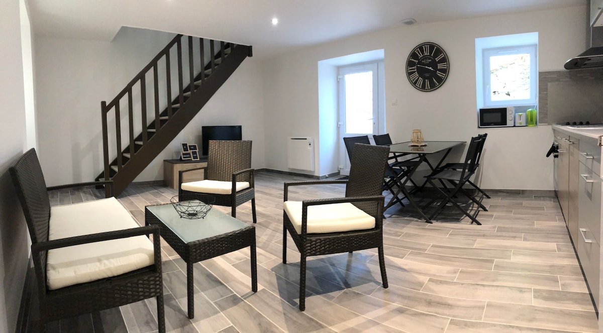 Charmante maison de 60m² avec terrasse privative, entièrement équipée, faisant partie d'un ancien corps de ferme datant de 1793, où nous résidons également. Le logement est entièrement indépendant avec un accès autonome. Il se peut que vous croisiez notre chemin dans le jardin, et pourquoi ne pas repartir avec quelques plantes en souvenir ! Confortable, paisible et baigné de lumière, cette maison sur deux étages peut accueillir jusqu'à 3 personnes. Idéale pour une pause ressourçante !