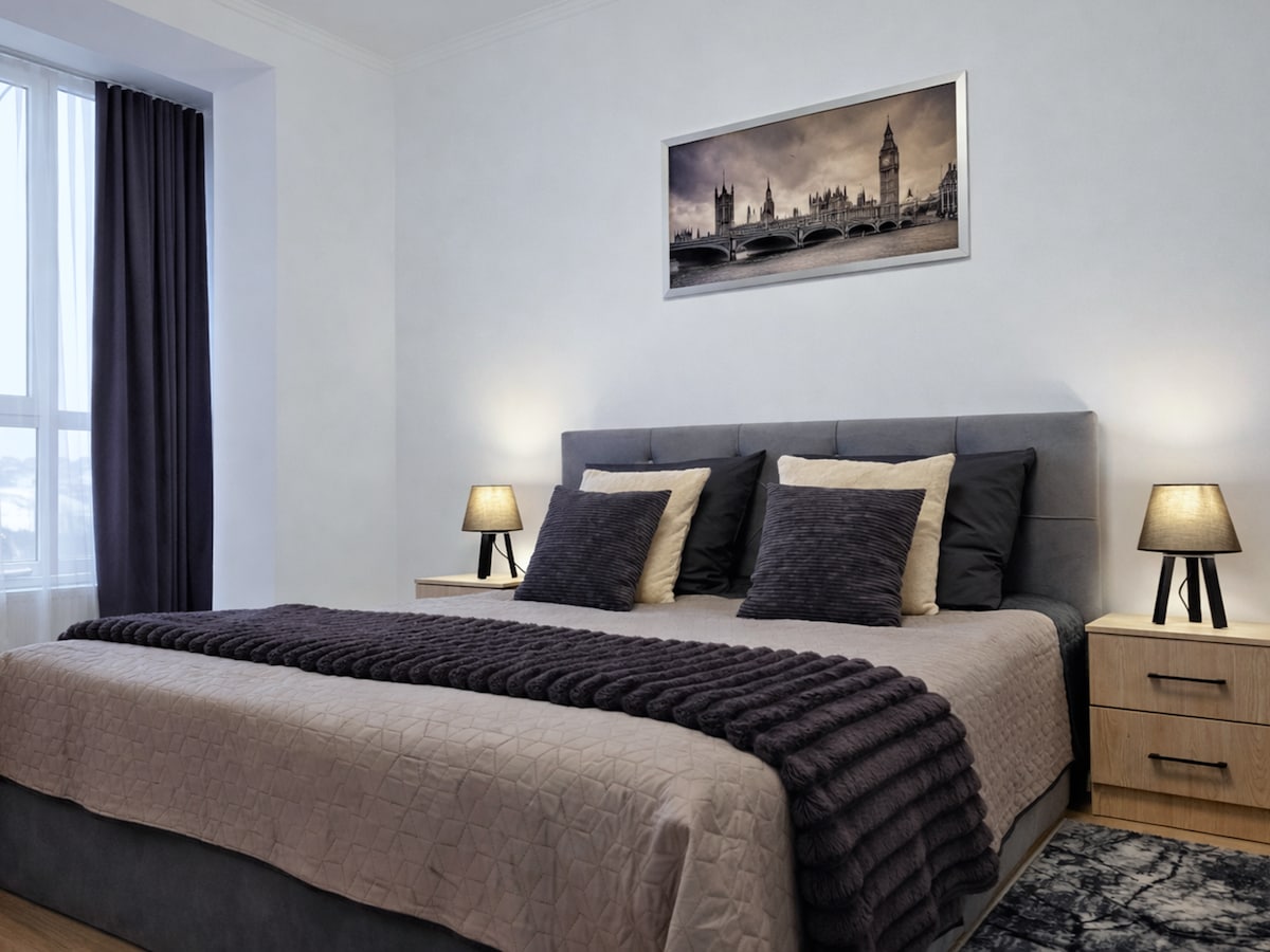 Open the door to a world of comfort and cosiness in our designer apartment located on the pedestrian street Olga Kobylianska, in the heart of Chernivtsi. We have made sure that your stay is as comfortable as possible. The apartment is equipped with everything you need for a pleasant stay: fully equipped kitchen with stove, kettle, fridge, microwave and necessary utensils; There is also a washing machine, Hairdryer and iron, Wi-Fi, TV.