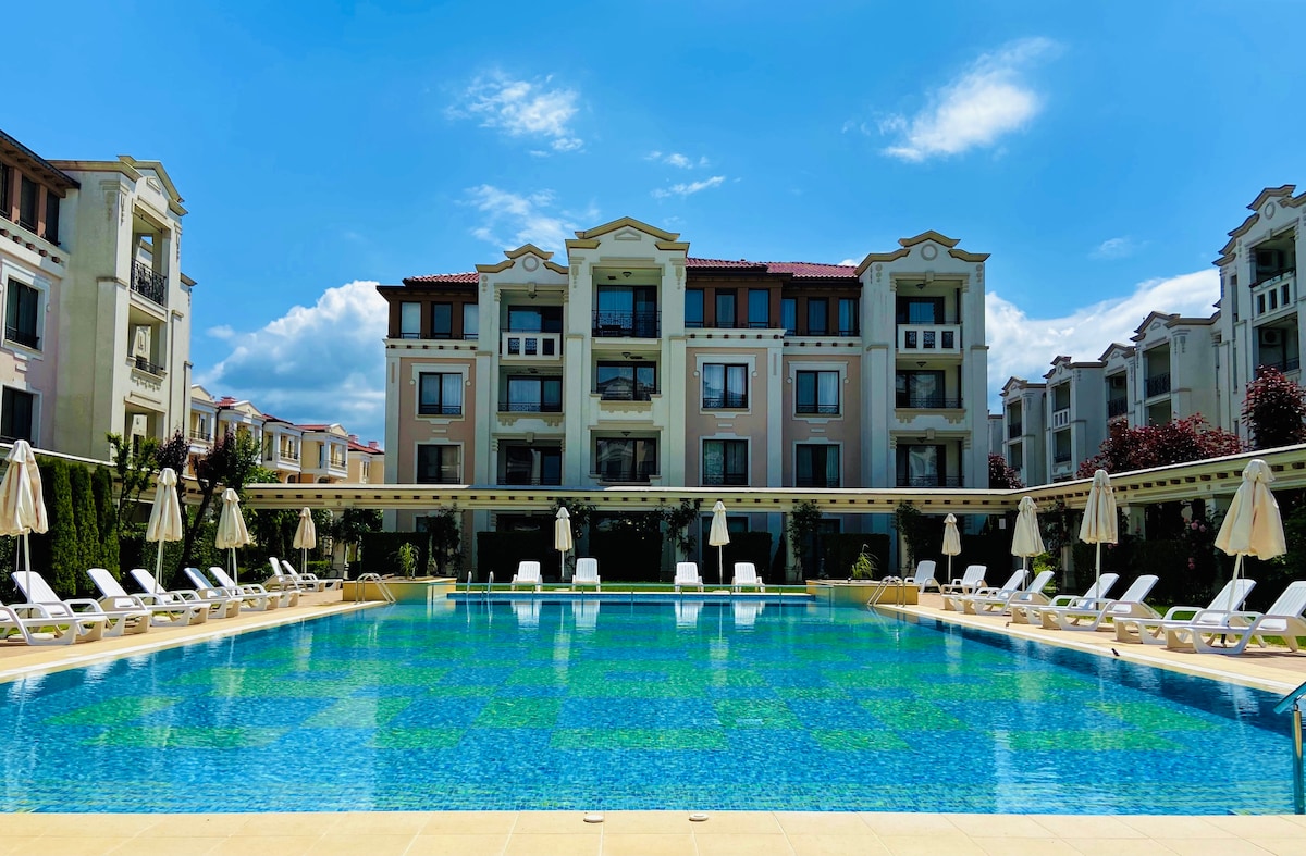Our cozy Studio Serenity is perfect retreat for couples or families with up to two children. Located in a peaceful area of Santa Marina, just steps from the beach and near a large pool, it offers a serene escape. Enjoy a private terrace, beautifully landscaped surroundings, and easy access to Sozopol, only 2 km away. Santa Marina offers 5 pools, kids' pools, restaurants, a playground, wellness centers, tennis courts, and convenient transport within the complex and to nearby beaches.