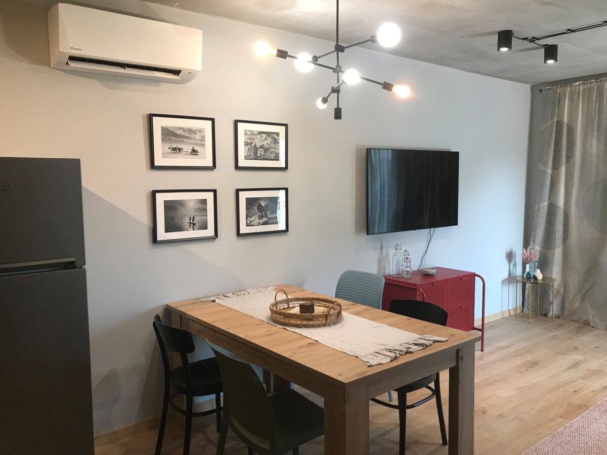 Stylish and bright apartment in the center of Burgas, close to shops, cafes, and major transport links—bus and railway stations are just across the street. The interior blends comfort and design: a cozy bedroom, relaxing living area with smart TV and fast Wi-Fi, air conditioning, and a fully equipped kitchen. Perfect for a city break, business trip, or seaside holiday — the Sea Garden is nearby, and the beach is a 15-minute walk away.