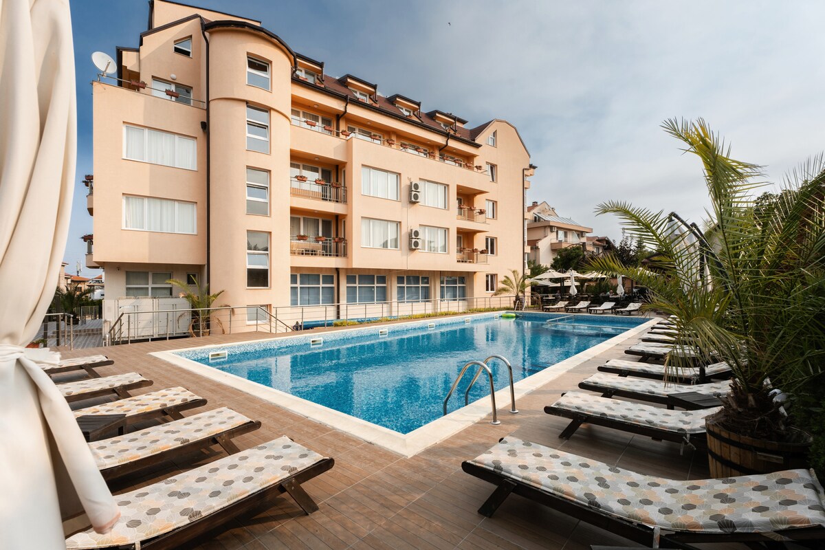 Our cozy Studio Serenity is perfect retreat for couples or families with up to two children. Located in a peaceful area of Santa Marina, just steps from the beach and near a large pool, it offers a serene escape. Enjoy a private terrace, beautifully landscaped surroundings, and easy access to Sozopol, only 2 km away. Santa Marina offers 5 pools, kids' pools, restaurants, a playground, wellness centers, tennis courts, and convenient transport within the complex and to nearby beaches.