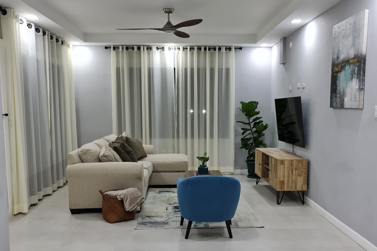 Experience modern living in this 2-bedroom, 2.5-bath gated home with 24/7 security, located just minutes from Hi-Lo and Fontana in Barbican. Perfect for 4 guests, the space offers a stylish interior, private balcony, rooftop pool, and 360-degree views. Amenities include air conditioning, fast Wi-Fi, a full kitchen, dedicated workspace, washer/dryer, free parking, and backup utilities. Enjoy a relaxing stay with easy access to Kingston's best spots, book now!