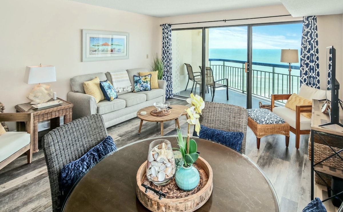 Spacious direct oceanfront corner unit with a panoramic view. Just steps from the beach and has the most amazing views of the Atlantic Ocean. Cherry Grove Beach is the absolute best area on the Grand Strand! Family friendly with lots of things do within walking distance. The building has free covered parking and 2 elevators. There is a full sized grocery store and several restaurants within walking distance. The unit is keyless entry for self check-in. Bath towels and linens are provided.