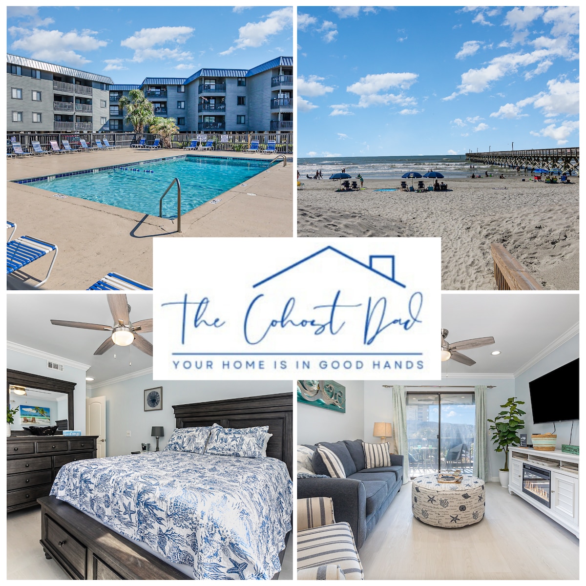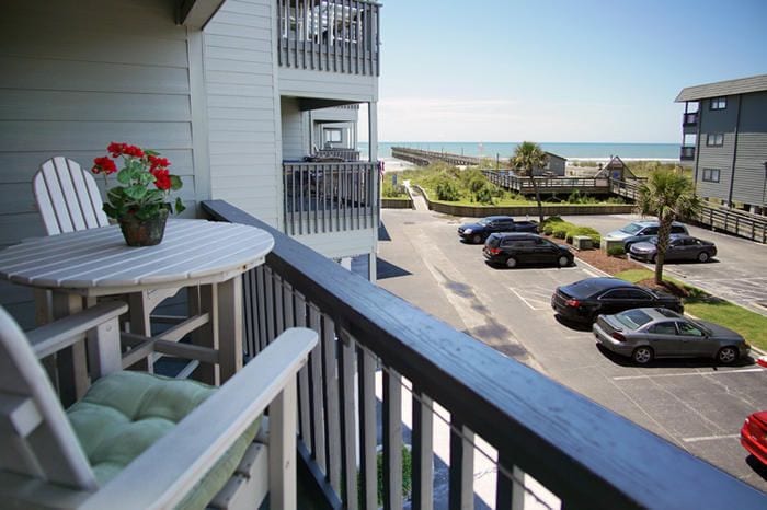 This stretch of Cherry Grove is one of the most magical places EVER. If you've not yet been to the point at Cherry Grove - get ready. It's so special. The complex is oceanfront, and our first floor unit has gorgeous view of the ocean from the deck and master bedroom. You're just a short walk down the hallway to the beach - literally a 30 second walk and you're in the sand.