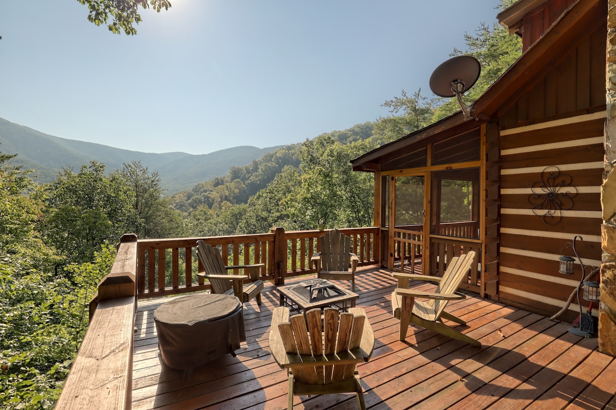 Picture driving up a winding, mountain road—wrapped in trees. Near the top, your rustic log cabin overlooks magnificent mountain views. You can breathe. Inside, a spacious living room with comfy furnishings, Big Screen TV, and cozy fireplace. An expansive covered deck beckons w/ wondrous views. Explore the woods, grill up a meal, or soak in the hot tub. Near hiking/mountain bike trails, you’re away from the crowds—but only 9.5 mi. to Downtown Blue Ridge.