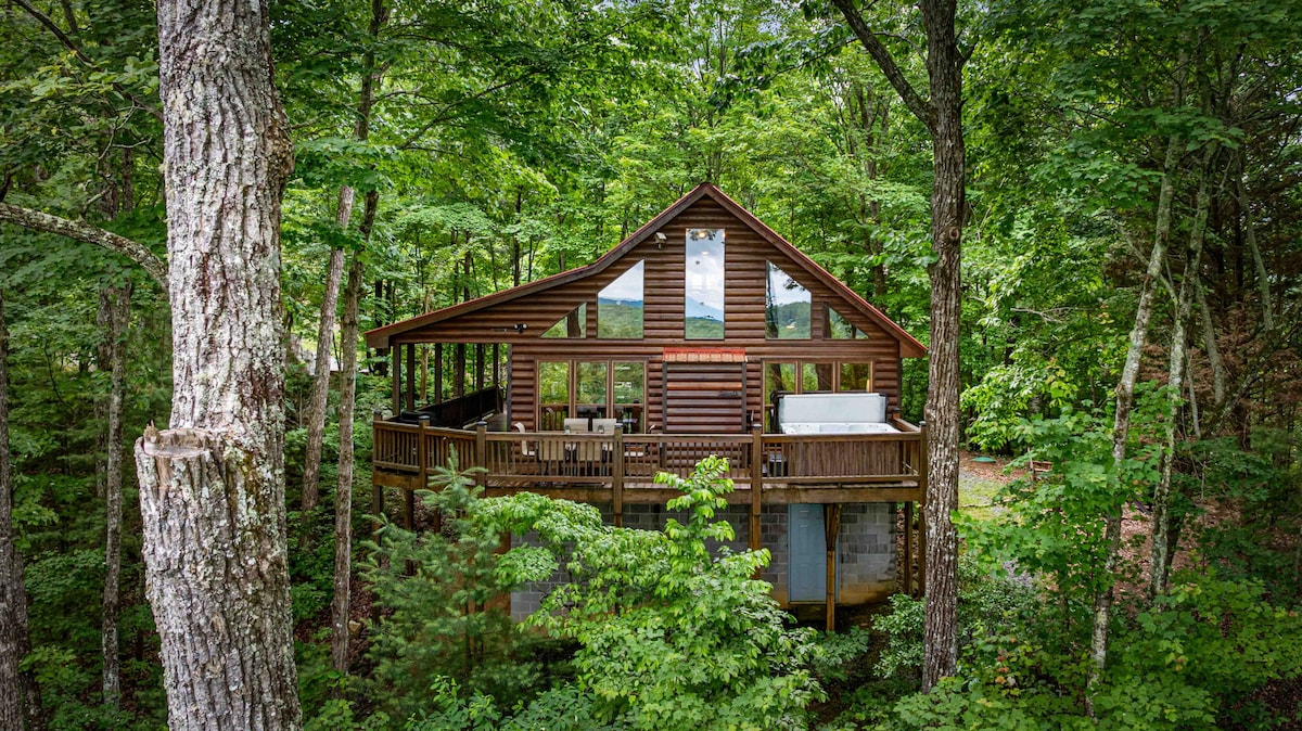 Picture driving up a winding, mountain road—wrapped in trees. Near the top, your rustic log cabin overlooks magnificent mountain views. You can breathe. Inside, a spacious living room with comfy furnishings, Big Screen TV, and cozy fireplace. An expansive covered deck beckons w/ wondrous views. Explore the woods, grill up a meal, or soak in the hot tub. Near hiking/mountain bike trails, you’re away from the crowds—but only 9.5 mi. to Downtown Blue Ridge.