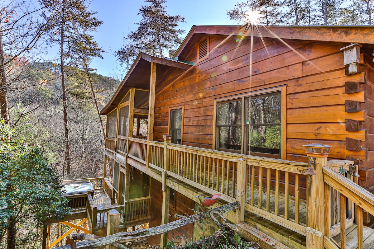 Our Cabin: 'Wandering Bear' is nestled on 3-acres of property, among the beautiful forests of Double Knob Mountain. Perfect for those seeking sunset views and a harmonious blend of nature, with the comforts of home. This romantic retreat invites you to stargaze from the hot-tub on the outdoor deck, or cozy up by the heat of the fire in our newly renovated living area. For those interested in wandering, we are positioned less than 30 minutes from both downtown Ellijay and Blue Ridge.