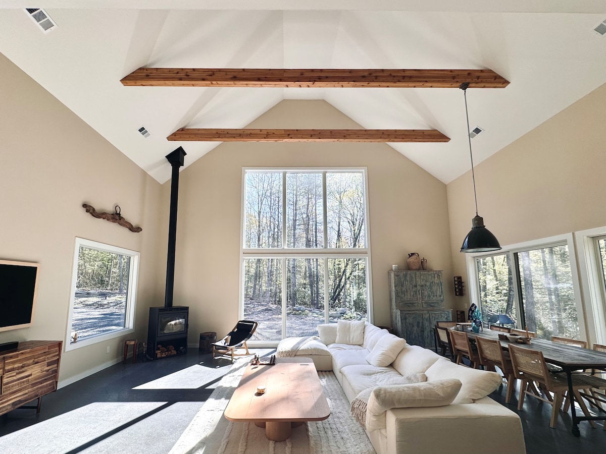 Escape to a serene cottage nestled on the Shawangunk Ridge. Unwind by the fireplace, soak in the private infrared sauna (with direct patio access), or relax outside on the natural stone terrace with a firepit and forest views. Crafted with care—from a 100-year-old reclaimed wood dining table to a curated “meaningful library” and hidden messages—this space invites calm, curiosity, and connection. Near trails, lakes, and local adventure. Thoughtful, cozy, and quietly unforgettable.