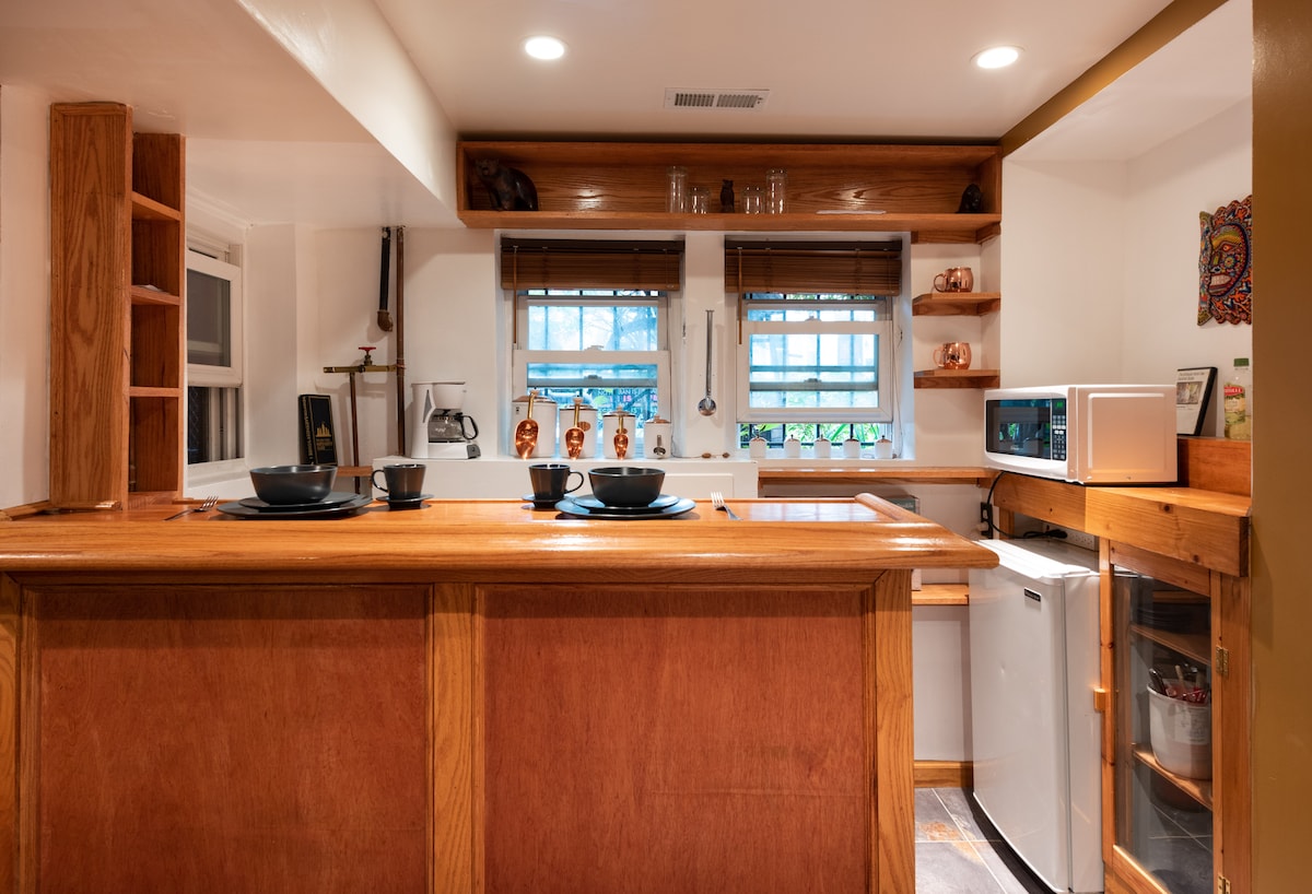 High-end suite with secure on-site parking, kitchenette with microwave, office desk, comfy king sized bed. We allow early check-in (8am) & late check-out (4pm) with keyless entry. No crazy rules or cleaning procedures - you get all the comforts of a hotel with homey touches of amenities: toiletries, chargers, high-speed WiFi and TV streaming. Steps away from Convention Center, National Mall and Smithsonian Museums, and other attractions.