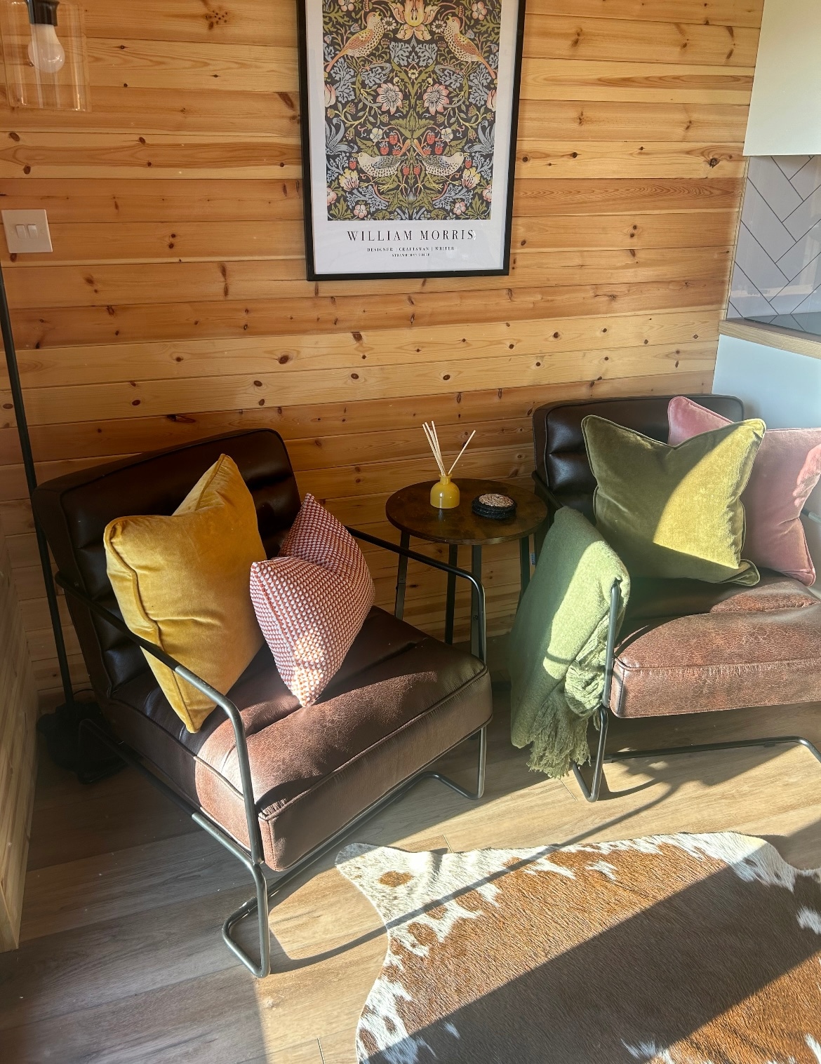 The Grand Fir forest lodge offers luxurious accommodation for up to 6 guests – the perfect place to catch up with family or friends! This log cabin has a large open plan living area with fully fitted kitchen and breakfast bar, dining area with seating for up to 6 guests, and a contemporary lounge complete with vibrant blue geometric Harlequin wallpaper, opulent lighting, plush royal blue suede sofa and matching bucket chairs, and a log burning stove.
