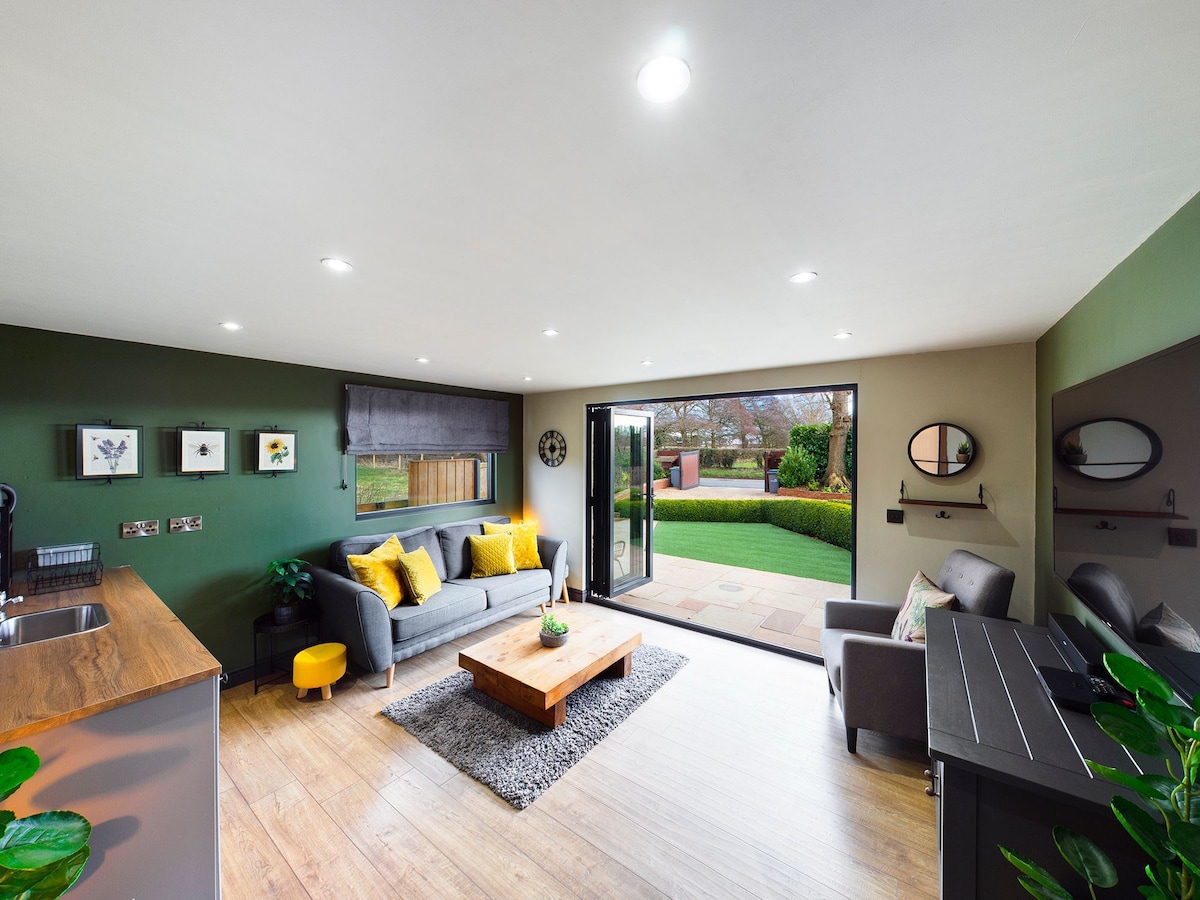 Beautiful, luxury, bright, spacious, brick-black clad Garden Bothy. Self contained. Bifold door opens onto a large south facing terrace looking out with lovely views onto our farmland. Double bed, high thread count sheets & plentiful towels. Modern luxury bathroom with large rainfall shower. Walking distance/short drive to Merrydale Manor Wedding Venue & less than 5 min drive to Colshaw Hall. Walkable to the excellent ‘The Dog’ pub. Walkable to main line train station to Manchester- Crewe.
