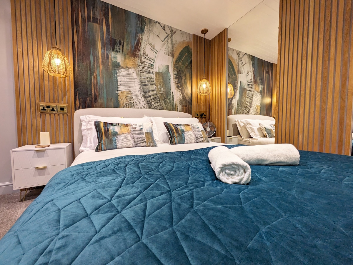 A design-led space and *NEWLY* refurbished apartment with it's own very private hot tub and luxury garden room, is located near the Worth Valley Steam Railway with stunning views of the hills. It is a five minute drive from the historic village of Haworth and is a perfect location for visiting the Brontë parsonage where the Brontë sisters lived and the moors which inspired their writing, the Yorkshire Dales, Ilkley and Saltaire. There is Netflix and a smart TV in the bedroom and living room.