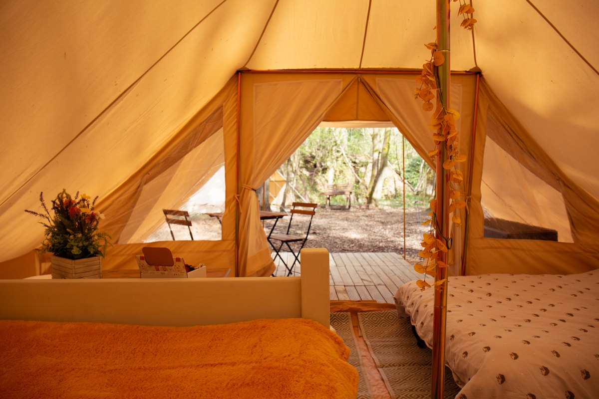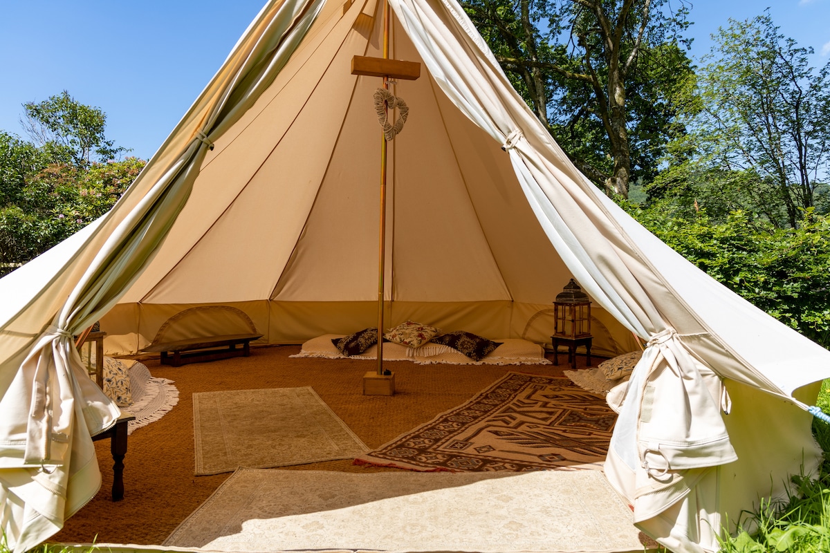 Escape to the great outdoors without sacrificing comfort in our beautifully furnished 5 - meter bell tent. Nestled in a quiet part of the site, and with incredible views this glaming experience offers the perfect balance of rustic charm and modern amenities. the bell tent is on part of south view farm pop up campsite Our bell tent has a double bed sleeps 2 but additional guests are welcome at a little extra cost we provide two single comfy camp beds guests just need to bring there own bedding