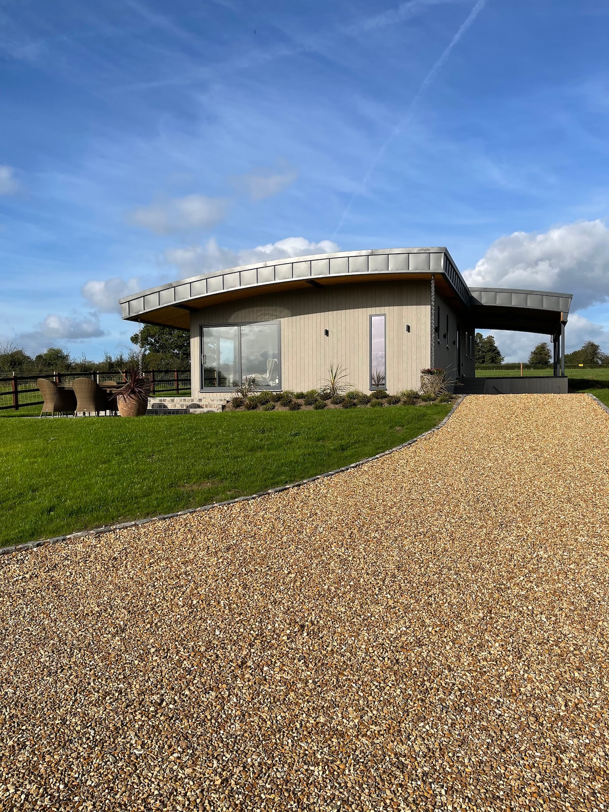 Wake up to panoramic views across the rolling Flintshire hills in this luxury, eco-friendly retreat - thoughtfully designed for romantic escapes and peaceful getaways. Sink into a king-size bed beneath a vaulted ceiling, with hotel-quality bedding, bespoke finishes and refined details throughout. On arrival, enjoy complimentary treats, fresh milk, and dog treats for our furry guests. Super easy access to Chester, Wrexham, Mold, Snowdonia and beyond.